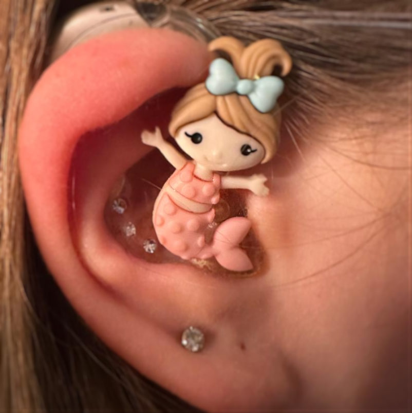 Dieser reizende Meerjungfrauen Anhänger lässt jedes Mädchenherz höher schlagen. Das kleine Meerjungfrauenmädchen hat braunes Haar und trägt eine niedliche hellblaue Schleife auf dem Kopf. Die Ohrschmuck Figur hilft Kindern, ihr Hörgerät mit Stolz zu tragen und verwandelt das Gerät in ein einzigartiges Schmuckstück.